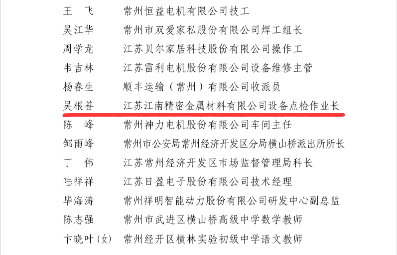 集團旗下江蘇江南精密金屬材料有限公司設(shè)備部點檢作業(yè)長吳根善被授予“常州市五一勞動獎?wù)?rdquo;。吳根善2004年進入江南精密,擔任設(shè)備點檢員,負責設(shè)備的安裝調(diào)試工作,2010年提拔為設(shè)備點檢作業(yè)長,負責全廠設(shè)備的日常點檢和維護工作。期間積極提出合理化建議并付諸行動,一個個“金點子”轉(zhuǎn)化為“金果實”,為公司帶來實實在在的效益。在公司降本增效的號召下,改造鍍鋅鍋爐余熱回收裝置,將退火爐尾氣熱能回收利用,每年為公司節(jié)省170萬元。他推動部分進口備件逐步實現(xiàn)國產(chǎn)化,為公司節(jié)約維護成本。鍍鋅鋅鍋工作環(huán)境差(高溫、噪音),他自主設(shè)計自動加鋅裝置替代傳統(tǒng)人工手動加鋅,達到安全、高效生產(chǎn)。由于工作表現(xiàn)突出,連續(xù)多年被評為“年度先進工作者”,并于2019年榮獲“武進金牌工人”榮譽稱號。