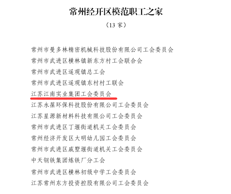 江蘇江南實業(yè)集團工會委員會被授予“常州經(jīng)開區(qū)模范職工之家”稱號。江南職工之家自2015年投用,為400名員工免費提供衛(wèi)生、整潔、暖心的生活家園。分為105個夫妻間和107個單集體間,另有12個套房。職工之家設(shè)有工會服務(wù)站、健身房、影音室、閱覽室、心理咨詢室和瑜伽室,滿足住宿員工的業(yè)余生活需求。宿舍提供洗衣機、冷飲機、微波爐等生活設(shè)備,方便入住職工使用。2022年,集團追加投入在職工之家實施亮化工程,美化住宿員工的生活環(huán)境,宣傳企業(yè)文化和先進員工典型。成長發(fā)展有空間,貼新舉措真服務(wù)。江南職工之家今后將進一步加強員工幸福生活建設(shè),保障好、服務(wù)好員工。