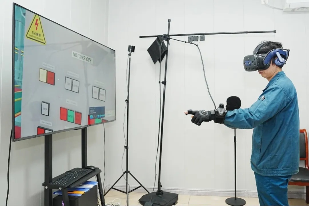 操作工唐志春在培訓(xùn)室里戴上VR眼鏡,用時1分25秒遠(yuǎn)程模擬了點位上的全自動焊接。他說:“企業(yè)將VR數(shù)字技術(shù)融入實操教學(xué)、操作測驗,要求員工都來嘗試,減少一次性操作故障率,并結(jié)合理論考試為員工打分,引導(dǎo)他們從操作工變?yōu)闄C械手。”