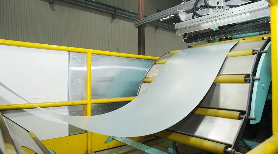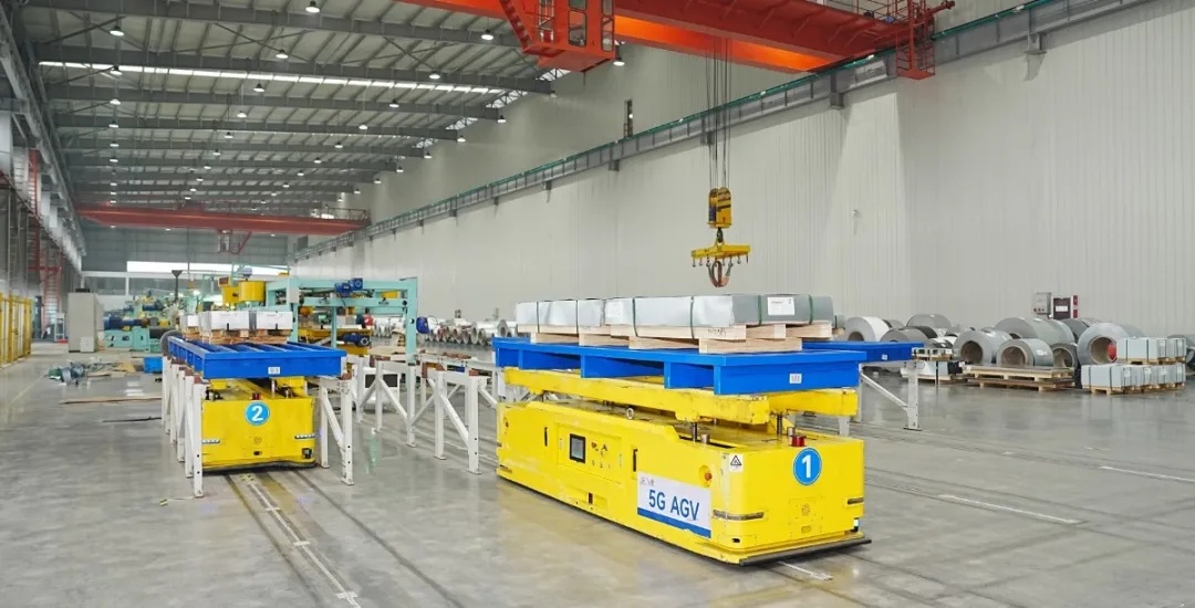 更多機器人走上工作崗位,在彩涂車間的生產(chǎn)線上,多組圓盤形刀具飛速旋轉(zhuǎn)將長長的鋼卷切割為一片片薄鋼板。當(dāng)?shù)毒咝枰鎿Q時,工作人員來到縱剪機組的電腦前,設(shè)定寬度、厚度、材料等數(shù)據(jù),機組內(nèi)的機械手臂便快速伸展,從數(shù)百個刀具中迅速配齊所需的十多個刀具,全過程不過一兩分鐘。黑色運輸帶上,寬800毫米、厚0.4毫米的金屬板材快速經(jīng)過,多臺工業(yè)攝像頭“火眼金睛”同步檢測。過去每片產(chǎn)品的表面質(zhì)量都靠人眼識別,如今工人在電腦端就可復(fù)核,大大減輕了工作量。機器讓員工更輕松,還反映在每天的步數(shù)上。剪切車間主任陶波說:“以前上一個班,在車間里能走到上萬步,現(xiàn)在走不了多少步了,因為有了‘代步’的AGV小車。” AGV小車不載人,承擔(dān)了物流搬運,并能處理上料、下料等。它穿行于車間,能精確、無誤差地接收信號,并沿著指定路線,準(zhǔn)確地將物料運送到智能立庫。