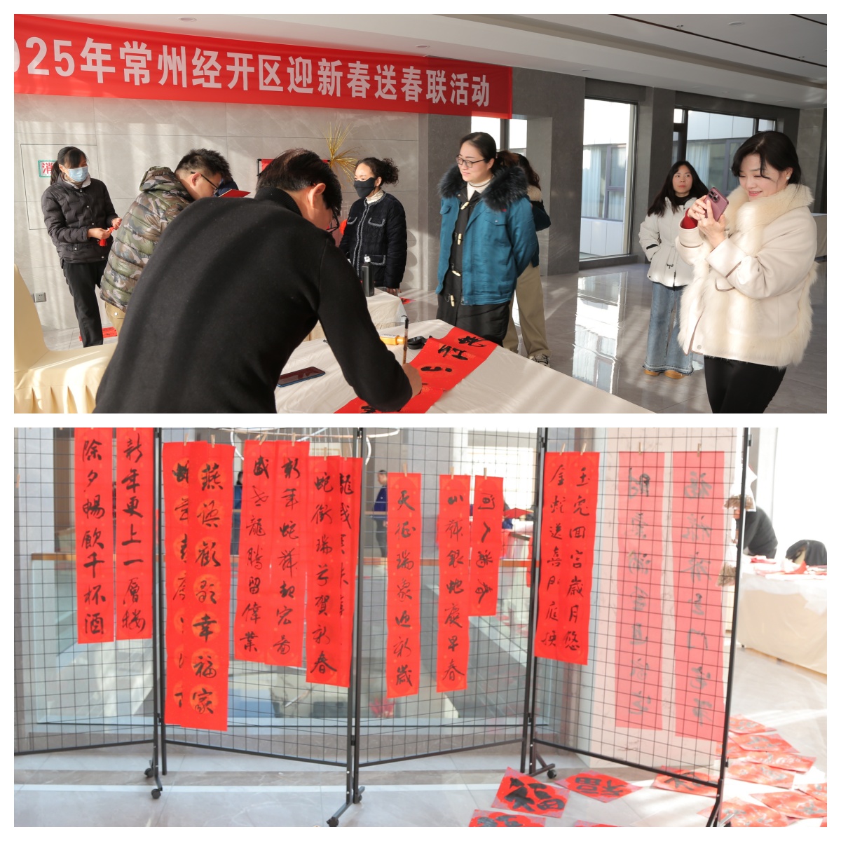 集團邀請了常州市書協主席、經開區書協主席等書法家到場,他們揮毫潑墨、筆走龍蛇,通過書寫祝福春聯,刻畫福字,把對新春的祝福與對未來的種種期望融入在一撇一捺之間,精妙的語句、喜慶的福字,美好寓意躍然紙上,展示著中國傳統的文化氛圍和書法的獨特魅力。“蛇行天下財運廣,福至人間好運來”、“金蛇狂舞迎春曲,丹鳳朝陽納吉圖” 等喜慶的春聯寄托了人們對新年的美好期盼,吸引了員工們駐足欣賞、挑選。活動現場墨香四溢,氣氛喜慶熱烈。