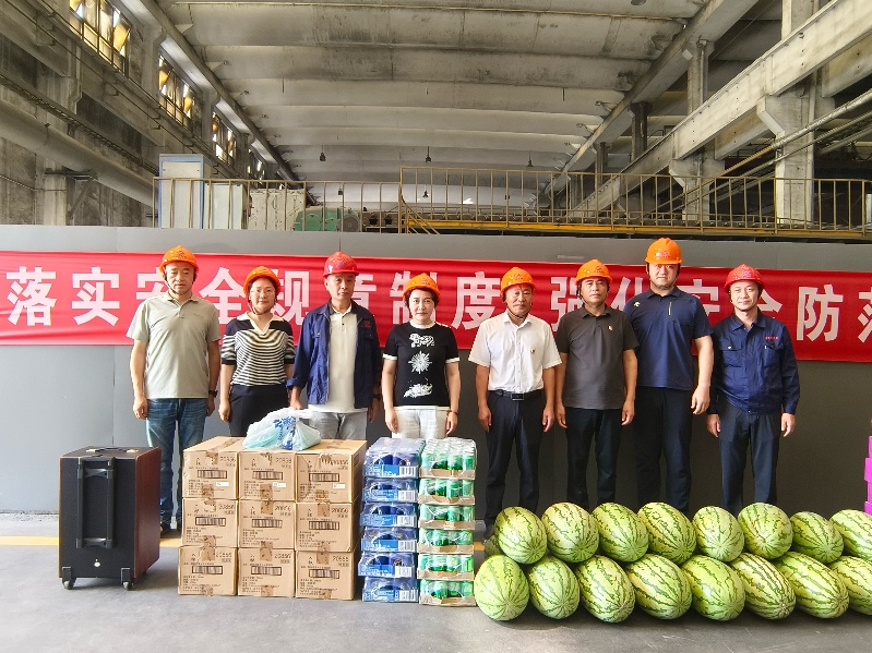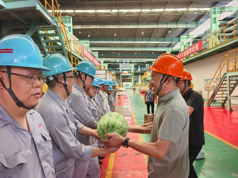 每到一處分公司的生產現場,劉萍詳細了解各崗位防暑降溫措施的落實情況,強調“既要保生產,更要保健康”,切實保障員工的身體健康和合法權益。她代表集團向大家在高溫下的堅守和付出表示感謝,對不畏酷暑保生產的敬業精神給予肯定。集團領導們將飲料、西瓜、葡萄、花露水噴霧等近170箱防暑降溫物品,紛紛送到一線員工手中,并反復叮囑大家高溫作業下要注意安全、勞逸結合