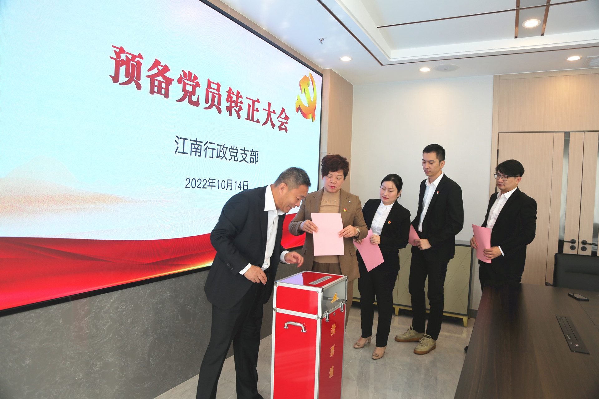 金秋十月,丹桂飄香,2022年10月14日上午,江南行政黨支部召開了預備黨員轉正會議,集團黨總支書記梅平、行政黨支部書記陸薺芳、以及13名支部同志參加會議。
