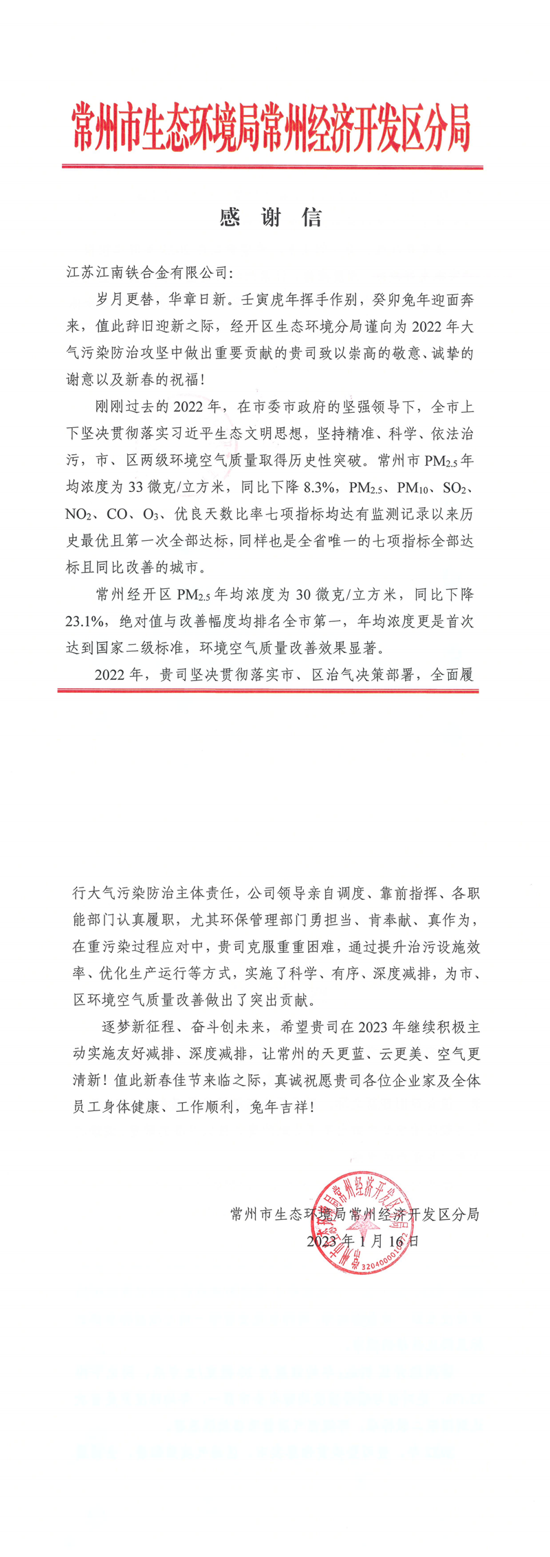新年伊始,2023 年元月 19 日上午,常州市生態環境局經濟開發區分局副局長張慶一行,特意驅車來到江南鐵合金公司,送上一份誠意滿滿的《感謝信》,對江南鐵合金在 2022 年大氣管控期間所作出的貢獻表示了肯定和感謝,并對來年的環境策劃、友好減排方面提出了更高的要求和期望。